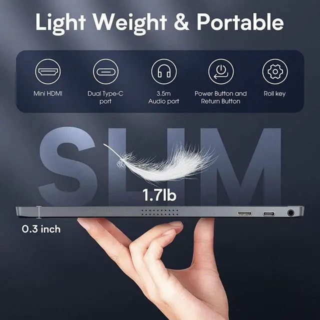 Portable Monitor Specifications: Lepow USB C Portable Monitor Net Weight: 1.7 lbs Visual area: 344.16*194.59mm Screen Size: 15.6 inch Panel type:IPS Aspect ratio: 16:9/ 4:3 Resolution:1920*1080 Display color: 16.7M Color temperature: 6800K Visual angle: H85/85Min V85/85Min Contrast ratio:10001 Brightness: 300cd/m Color gamut: 72% Refresh rate: 60 Hz Input interface: Mini HD(Video signal), Type C full function( Video data, Power supplyISDN), Type C power supply Output Interface: 3.5 mm headphone interface Speaker: Built-in speakers (1 W*2) System requirement: devices with an HD output interface, computers with full Type C video output capability PackageContents: LepowType-cPortableDisplay x1 Mini HDMI to HDMI cable x1 Type C to Type C cable x1Type C to USB A cable ( Power Supply ) Smart Cover x1 Screen Protector x1 User Guide x1 Note:Please check if the Type C of your laptop is a full-featured Type C port.If itisjusta Type C forcharging,itwillnotbeavailable.