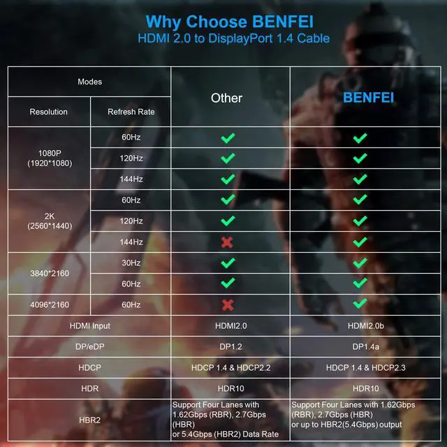 - COMPATIBLE VIDEO - BENFEI HDMI-DP Cable, HDMI source and DisplayPort display must share a compatible resolution