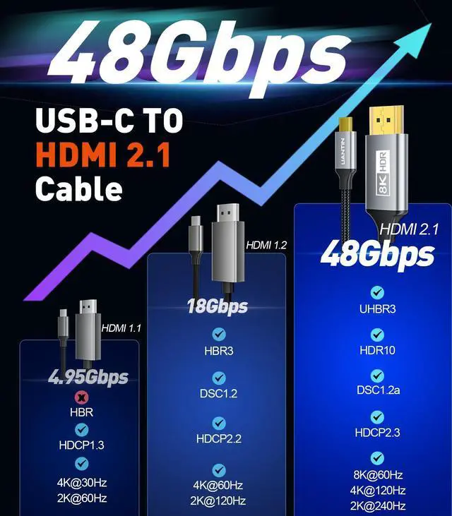 ![Alt view image 7 of 7 - USB C to HDMI 2.1 Cable 8K@60Hz, 4K@144Hz/120Hz, 48Gbps, HDCP2.3, Dynamic HDR, Type C to HDMI Braided Cord [Thunderbolt 3/4/5 Compatible] for iPhone 16, MacBook Pro/Air, Dell, HP, Surface, 6FT](https://c1.neweggimages.com/productimage/nb640/C5MSD2603100B23IOB6.jpg)
