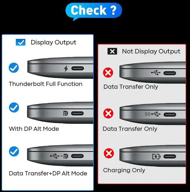 | (?) | (?) Not compatible with devices that don't support the protocol of DP Alt Mode. |