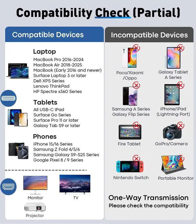 | ?USB 2.0 | The devices from Xiaomi / Motos / OnePlus that do not support DP Alt Mode. |