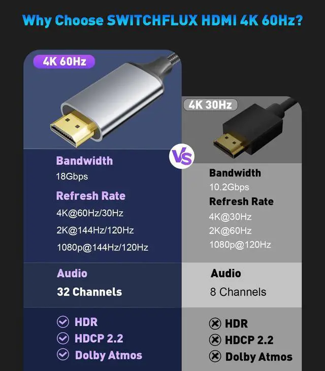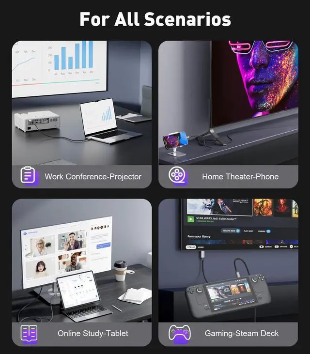 Amazing 4K Visual EffectsThe USB C to HDMI cable supports up to 3840*2160@60Hz resolution for extraordinary HDR visual clarity at smooth 60Hz in stunning 4k UHD resolution, with perfect audio pass-through to immerse you in true cinematic enjoyment. Backward compatible with 3840*2160@30Hz, 2K@120Hz, 1080P
