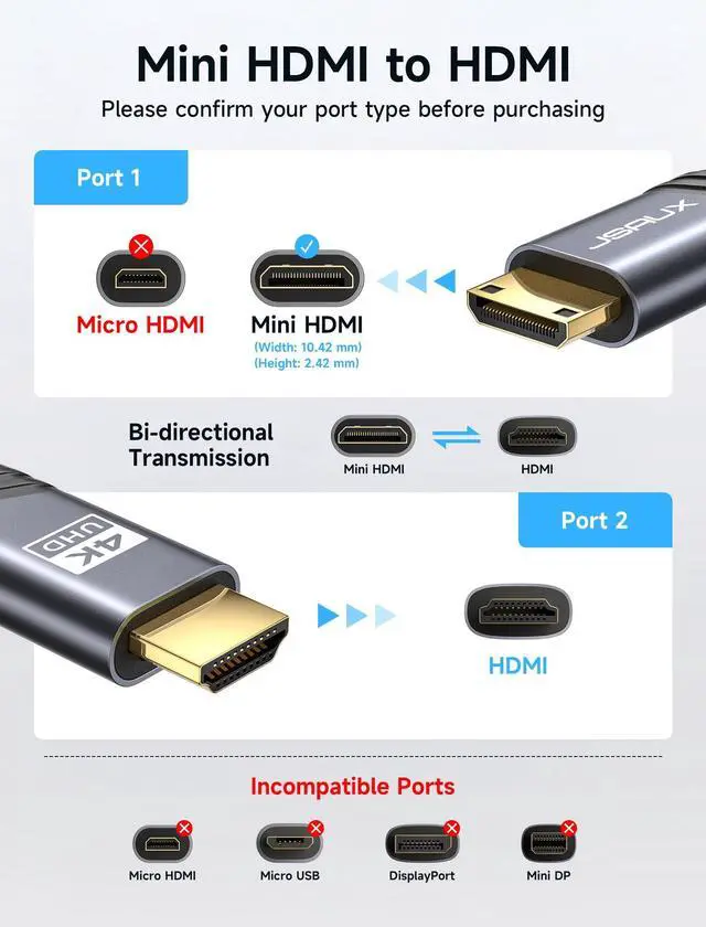 This is Mini HDMI to HDMI cable (HDMI Type C to HDMI Type A), NOT Micro HDMI or Micro USB. Please check your device's port before purchase.