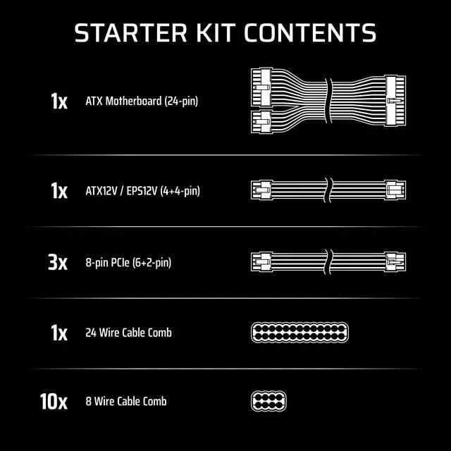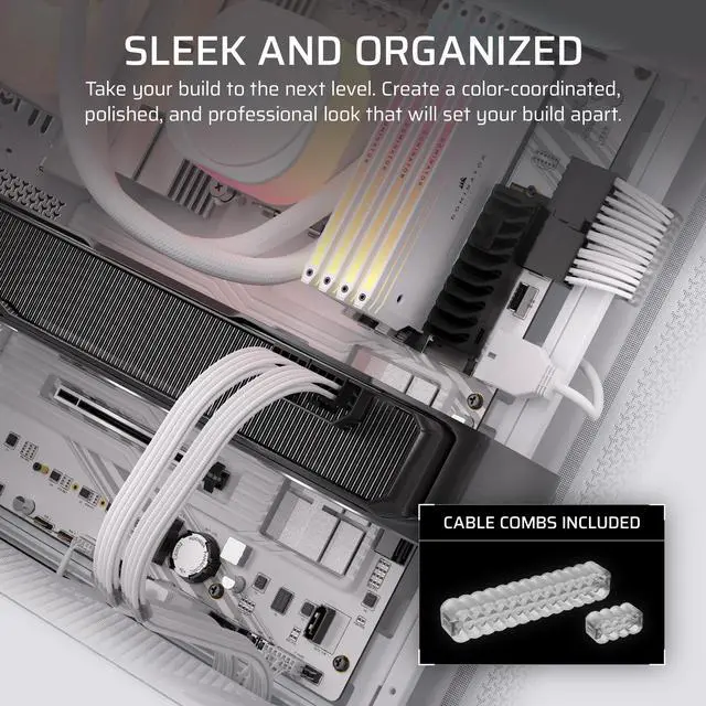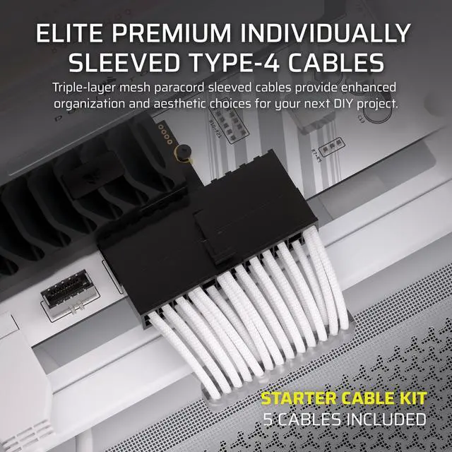 The CORSAIR Elite Premium Individually Sleeved Type 4 Starter Kit includes the essentials to upgrade your power supply to flexible paracord sleeve. Available in black, white, or black/white, they can match your system’s style or add a dash of color to an all-black build. The flexible paracord mesh cables include pre-installed modular cable combs, which make achieving a professional-looking build easy, and legendary CORSAIR quality ensures top-tier performance. The cables are compatible with any CORSAIR power supply that uses Type-4 cables and are an instant visual upgrade.