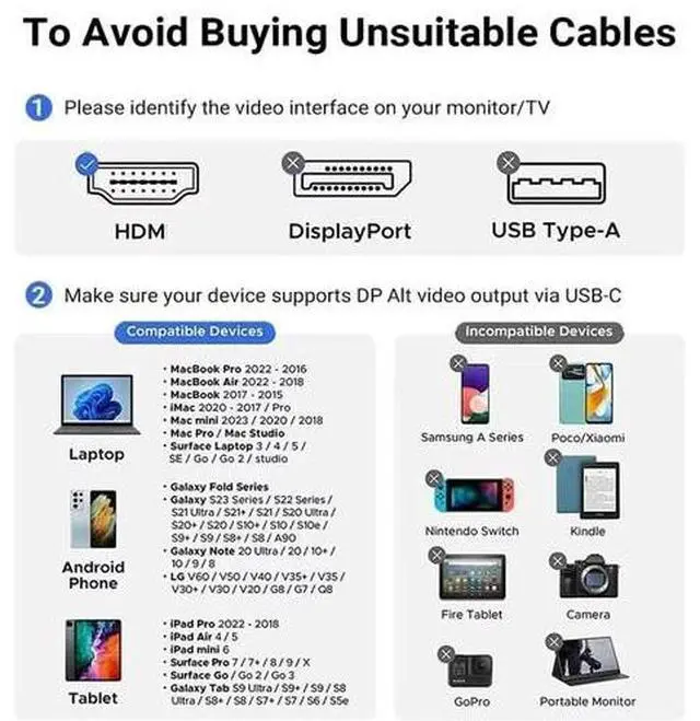USB Type C to HDMI cable:USB C to HDMI cord can transfer 4K content from your laptop, mobile phone, or tablet to a larger display, providing you with clear and realistic images, which means you no longer worry about unstable WiFi Connectors: USB C 3.1 Gold-plated male (Input) HDMI 2.0 Gold-plated male (Output) Specification:Shape: Compact,lightweight,easy to carry Installation : Plug and Play,No driver or software installation required Gold-plated connectors : Optimize its performance,resist corrosion High-quality aluminum alloyExcellent heat dissipation effect Nylon braided cable:Durable to ensure long-term use Ultra HD : Supports resolution up to 4K@30HzPackage Contents: 1X USB C to HDMI Cable-6FT-Gray Note: 1.This is NOT a bi-directional 2.Make sure that your devices support 4K@30Hz resolution, otherwise 2K@120Hz,1080P screen display may appear 3.Before use, please modulate the display to the HDMI port to receive the signal