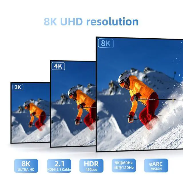 8K HDMI cable: using high-end technology, supporting 8K@60Hz as well as 4K@120Hz With a transmission speed of up to 48Gbps bandwidth and precise signal source processing, it can present color details well, support HDR and 4-channel, and support 21:9 screens It is an essential accessory for entertainment and office use.