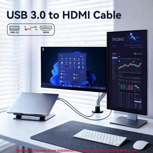 Vivid 1080P@60Hz ResolutionThis USB A 3.0 to HDMI Cable supports 1080P@60Hz, delivering vibrant colors and ultra-smooth frame rates. Supports dual-screen display and external monitor that boost productivity by 50% when handling spreadsheets, video editing, or multi-tab browsing(Need to install the driver the first time you use it)