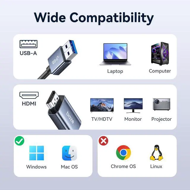 Broad Compatibility: The USB 3.0 to HDMI Cable is compatible with Laptop TV systems, supports Windows/MacBook, Works with Smart TVs, projectors, and curved gaming monitorsNot compatible with Chrome OS and Linux P devices