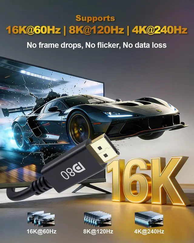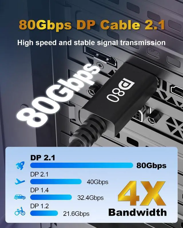 High Speed 80Gbps Bandwidth -- This displayport 2.1 cable is delivers guaranteed 80Gbps high-speed data transmission. Supports ultra-high-definition resolutions up to 16K@60Hz, 10K@60Hz, 8K@120Hz, 4K@240Hz, 2K@240Hz, ensuring no lag, no flicker, and no signal loss during video playback - meeting all your DP needs.