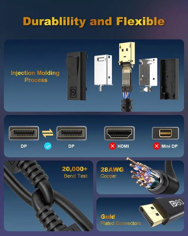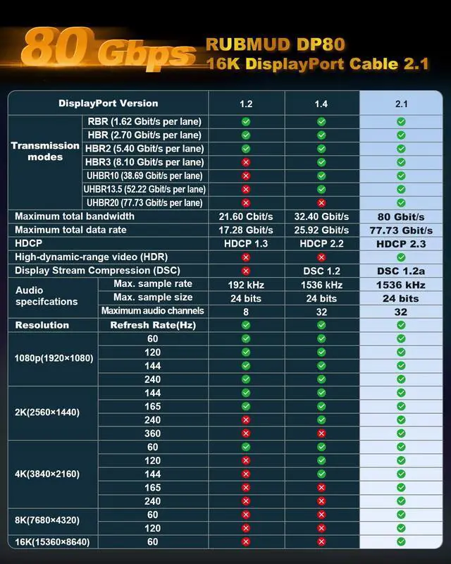 DP80 Cable -- The RUBMUD display port cable supports 16K@60Hz, 10K@60Hz, 8K@120Hz/60Hz, 4K@240Hz/165Hz/144Hz, 2K@240Hz/165Hz/120Hz, and standards including HDR10, HDCP 2.3/2.2, DSC 1.2a, and 3D ect. Backward compatible with DisplayPort 2.0/1.4/1.3/1.2/1.1/1.0. Please Note: Only for DP to DP connections, NOT HDMI or Mini DP.