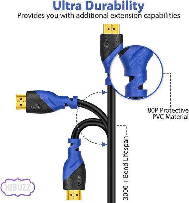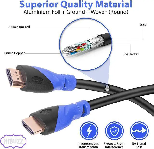 XIBUZZ 30 Feet HDMI Cable can compatible with Blu-Ray player,PS3,PS4,XBOX 360,DVD Players,3D TV's, Computer, Home Entertainment device, and other HDMI-compatible devices. Product Features: Fully HDCP compliant to provide the highest level of signal quality. Cable use 24K gold plated connectors and high-quality PVC material,CL3 rated for in-wall installations, with environmentally-friendly,wear-resisting and aesthetic features to ensure the using process more secure and reliable. 3D Support,4K@60hz 1080P resolution and HDMI Ethernet Channel,Audio Return Channel and more. Supports Transfer Digital Audio and Video signals at warp. The cable can reach 18Gbps transfer speed and bring you faster HD experience. Fit Blu-Ray player,PS3,PS4,XBOX 360,DVD Players,3D TV's,Computer and more HDMI-compatible device. Product Specification: HDMIv2.0 Specification Male-To-Male Connectors. HDMI2.0 Version OD:8.8 ± 0.2mm 3D Support,4K@60hz 99.99% Oxygen Free Copper conductor 24K Gold Plated connectors High-quality PVC material With CE,ROHS and REACH Certification 36 Months Warranty PLEASE NOTE: INPUT DEVICE:Connect Laptop,PC, DVD,Cable Box,TV Box,Blu-Ray Player and more source device with HDMI Port. OUTPUT DEVICE:Connect HDTV,Monitor,Projector and more display devices with HDMI Port.