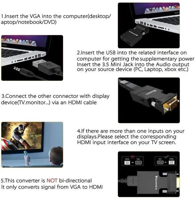 Not Bidirectional: Only from VGA to HDMI Display (TV/monitor). It only converts from VGA (analog signal output ) to HDMI (digital signal input). Can not be used as a HDMI to VGA converter cable.