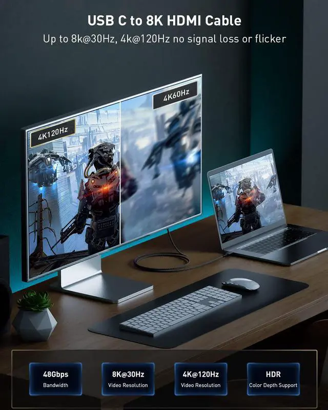 HDMI 8K ]: Maxonar USB-C to 8K HDMI Cable combines the latest HDMI 2.1 standard with the versatility of USB-C. It's supports resolutions up to 8K@60Hz delivering picture with UHD resolution from your usb c device to monitor and providing you a stabler and smoother performance without flicker. Downwards compatible with 4K@120Hz 4K@60Hz. [