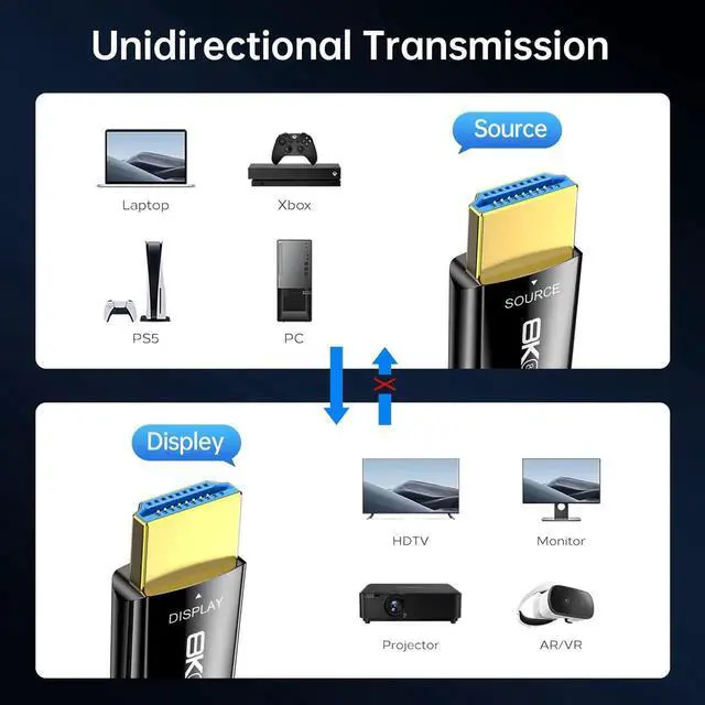 8K Fiber Optic HDMI cable: Higher video resolutions support higher resolutions and faster refresh rates including 8K@60Hz 4K@240Hz/120Hz. Wide Compatibility: 8K HDMI cable with last version 2.1, backward compatible with version 2.0 / 1.4 / 1.2 / 1.1 .Support for Laptop, HDTV, Blu-Ray Player, Monitor, Projector, etc. Thin HDMI 2.1 cable: fiber optic HDMI cable, have greater bandwidth and faster speed, less signal attenuation, longer life than traditional copper cores, and thinner and lighter. Strong Performance : Support for 3D video,8K 7680*4320 resolution, 8K@60Hz 4K@240Hz/120Hz, HDR, dynamic HDR, VRR, QMS, enhanced audio return channel eARC. The optical fiber hdmi cable is uni-directional transmission, The plugs at each end are marked "SOURCE/DISPLAY", please note that source is the signal source (such as laptop, PC, ps4/ps5, xbox and Blu-ray player etc) and display is the display end (such as monitor, TV, projector etc).