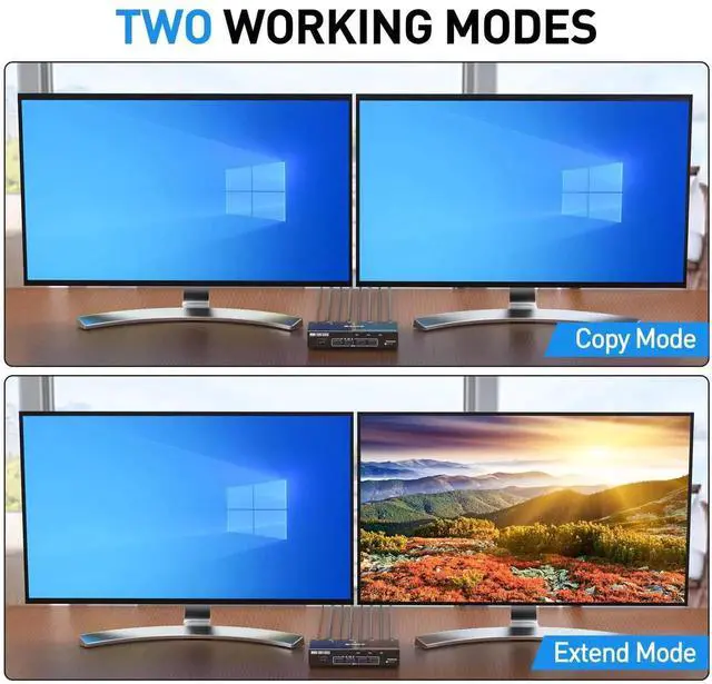 KVM switch dual monitor hdmi support extend display mode or copy display mode, when in "mirror" mode the main screen can be copied to the second screen output two identical screen. When in "Extend" mode, the window from the main screen can be dragged to the second screen output two different screens.