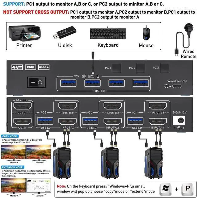 USB 3.0 Dual Monitor KVM switch HDMI support resolution @,@,@. 3 computers 2 monitors KVM switch aslo support input terminal to connect 2 computers with different resolutions, e.g. one is 4K@60Hz, the other is 4K@30Hz, 1440P@60Hz, 3D,1080P@60Hz or lower resolution.
