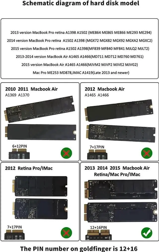 Compatible with 2014 Macbook Air A1465 A1466 (MD711 MD712 MD760 MD761) SSD. Compatible with 2014 MacBook Pro retina A1502 A1398 (MGX72 MGX82 MGX92 MGXA2 MGXC2) SSD. Compatible with 2015 MacBook Pro retina A1502 A1398 (MF839 MF840 MF841 MGXA2 MGXC2) SSD. Compatible with 2015 MacBook Air A1465 A1466 (MJVM2 MJVP2 MJVE2 MJVG2) and Mac Pro ME253 MD878 SSD.