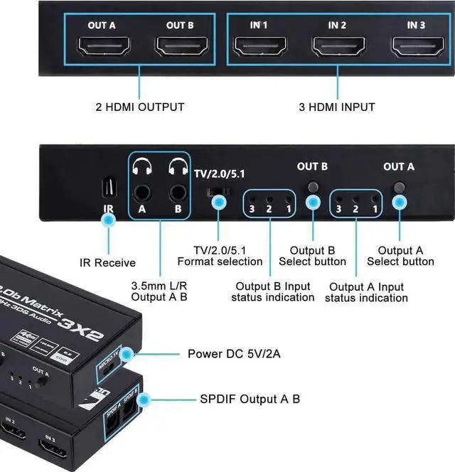 • This HDMI 3x2 Matrix Switch can connect three 4K HDR signal sources to 2 HD display or monitor,and it can also extract the HDMI input Audio signal with Toslink SPDIF optical fiber or 3.5mm stereo headphone output. This 3x2 HDMI Matrix can control by IR remote control and Local Button. It allows 3 HDMI Output devices to be switch or split easily to two HDMI compatible monitors or projectors.