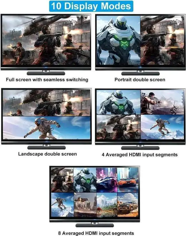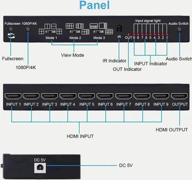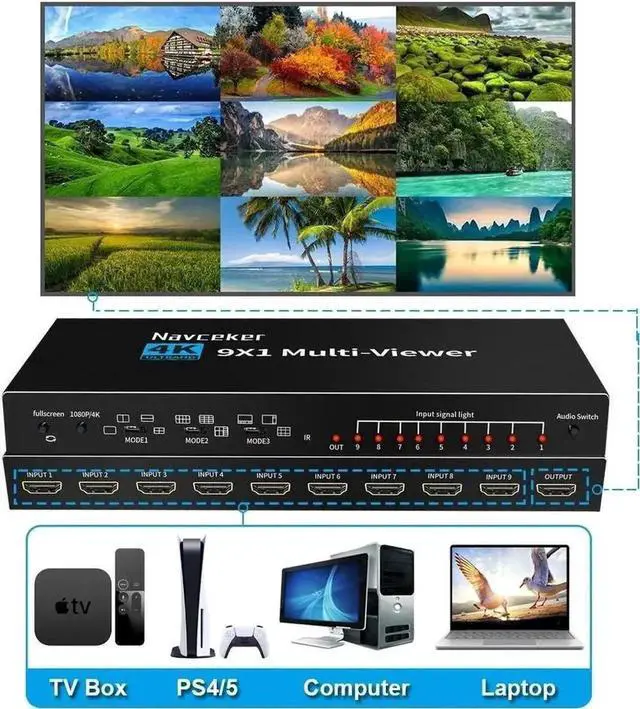 - Widely Compatible: HDMI 9X1 Quad Multi-viewer support HDMI 1.4 and HDCP 1.4 and backward compatible. 9 HDMI input port support connecting DVD player, Apple TV, Blu-ray players, PS3/PS4, PS5, game console, fire stick, etc. HDMI output port support connecting various HDMI display device like monitor, HDTV, projector.