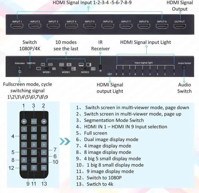 - Remote Control and Button Control: 9x1 Quad Multi-Viewer with function buttons and attached IR remote control. Manual button and remote control both support switching input source, selecting full screen mode or quad modes and switch input source's audio;