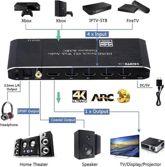 There are 4 ports HDMI input,1 port HDMI output with ARC function, Toslink output, Coaxial Output, 3.5mm Jack output.