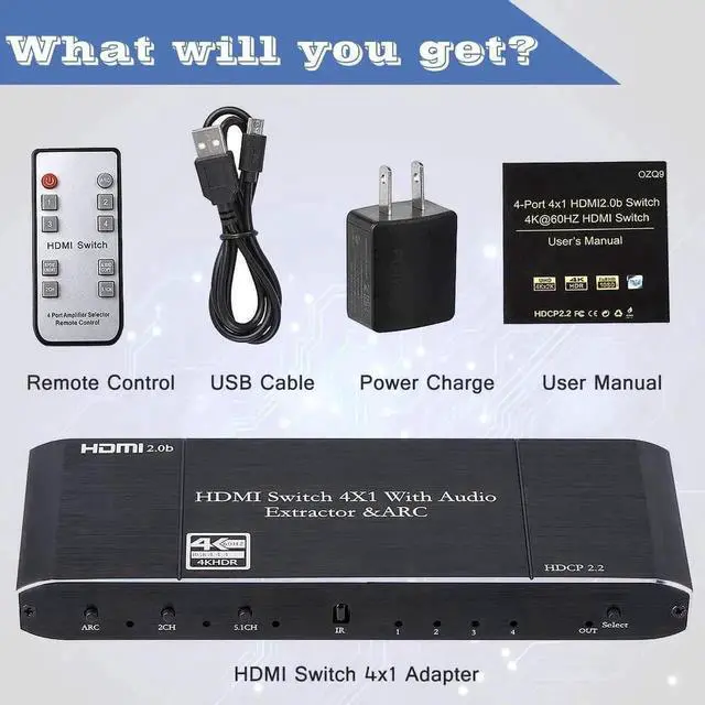 HDMI Switch with Audio Extractor 4K 60Hz Optical + 3.5mm AUX + Coaxial Output, HDMI Switcher 4 in 1 Out HDMI Audio Splitter Converter IR Remote Support ARC HDCP2.2 1080P 3D Dobly Atmos,EDID,HDR10