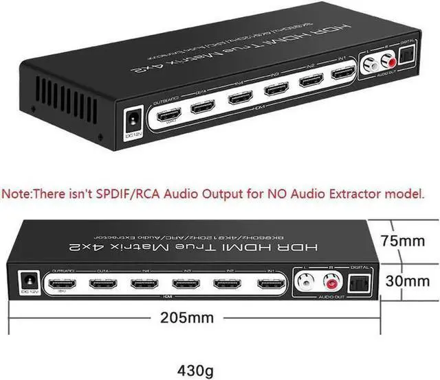 The 8K HDMI Matrix switch splitter 4X2 supports audio extraction functions. It can extracts audio from the selected HDMI video source.