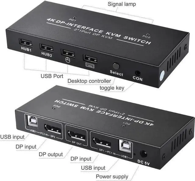 • DisplayPort KVM Switch 2x1 4K 60Hz DP 2 in 1 out USB KVM Switcher Displayport 1.2 Switch KVM DP Switch Support USB Mouse&Keyboad