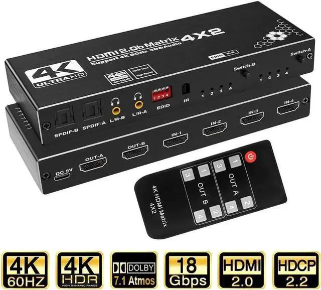 - 4 HDMI inputs switch and split to 2 HDMI displays