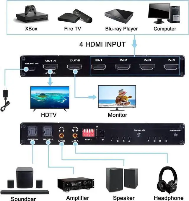 [Upgrade 4 IN 2 OUT matrix]-This 4K HDMI matrix can connect up to 4 HD signal sources to 2 HDMI Display terminals via optical fiber or stereo headphone output, it allows easy switching or splitting of four HDMI devices into two HD displays. The power supply port is designed to be on the same side as all HDMI ports for easy connection. Solutions suitable for home theater, office, school, meeting room, shopping center, hotel or museum.