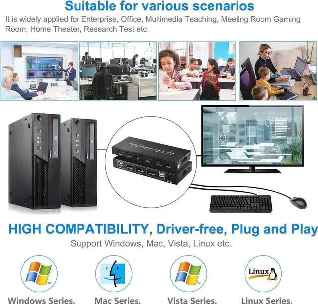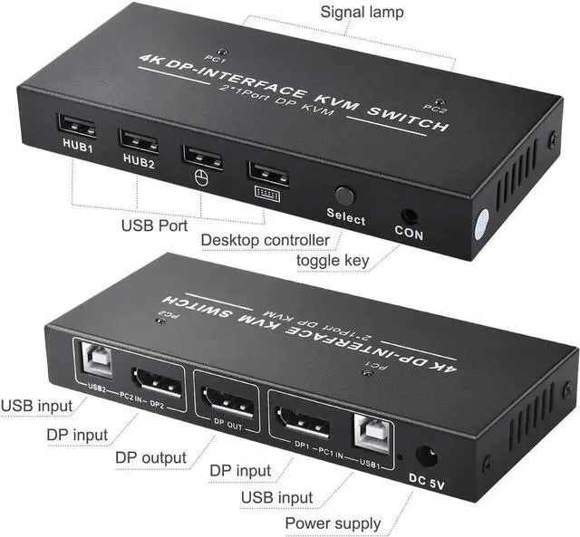 • 2 Port Displayport KVM Switch 4K 60Hz USB DP KVM 2 in 1 out DP USB KVM Switch 2x1 For PC to share monitor mouse keyboard printer