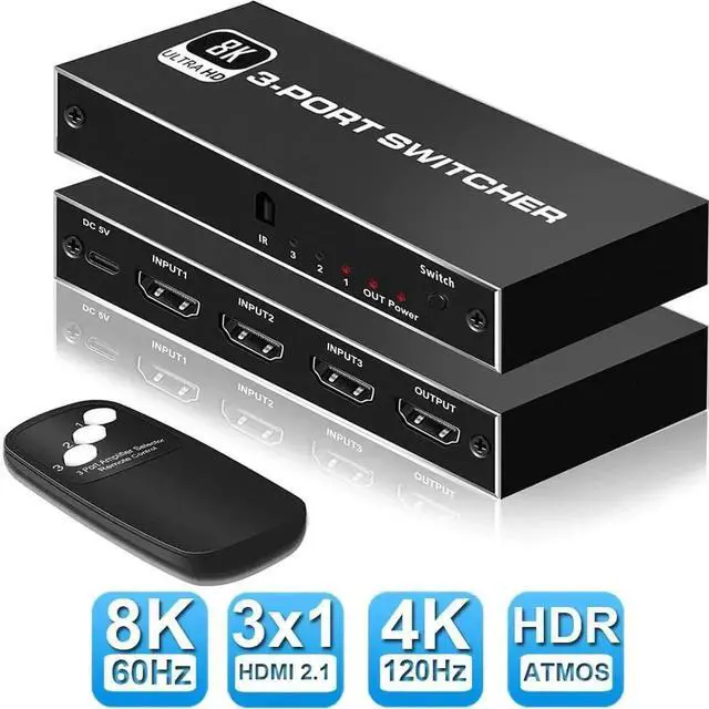 HDMI 2.1 Switch: 8K HDMI switcher 3 in 1 out can allow 3 different HDMI sources devices to 1 HDMI display device, NO lag, NO flash or drop in resolution. It also can be powered, which will make your transmission more stable. Perfect for home, office, meeting and other scenario. (Note: It is not 1 In 3 Out Splitter)