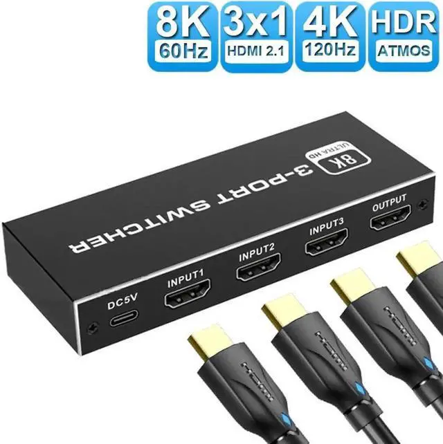 HDMI 2.1 Switch: 8K HDMI switcher 3 in 1 out can allow 3 different HDMI sources devices to 1 HDMI display device, NO lag, NO flash or drop in resolution. It also can be powered, which will make your transmission more stable. Perfect for home, office, meeting and other scenario. (Note: It is not 1 In 3 Out Splitter)