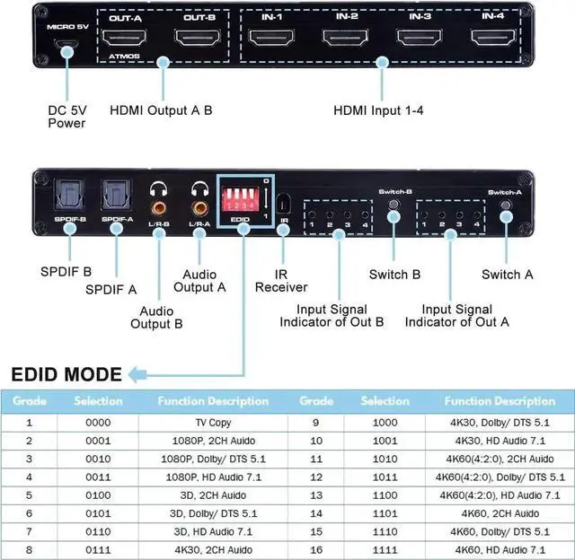 [Scaler EDID and audio segmentation]- Support for automatically reducing 4K resolution to 1080P(other resolution downgrades are not supported). 4K video source devices can simultaneously display 4K content to 4K TV and 1080p content to 1080p TV through Scaler EDID. (Note: At this time, please set EDID to "0000") Any input high-definition signal source can be extracted separately or at the same time through SPDIF or 3.5mm headphone audio output port.