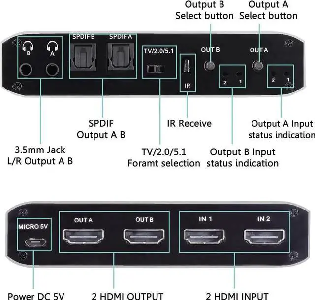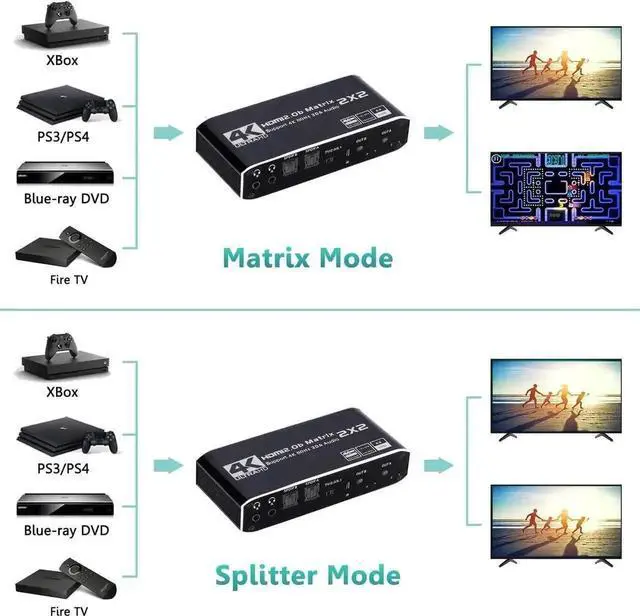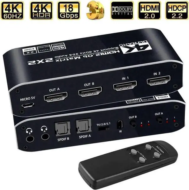 HDMI Matrix 2x2: HDMI Matrix Switch can connect two 4K HDR signal sources to two HD display or monitor, and it can also extract the HDMI input Audio signal with Toslink SPDIF optical fiber or 3.5mm stereo headphone output. It can also control by a IR remote control.