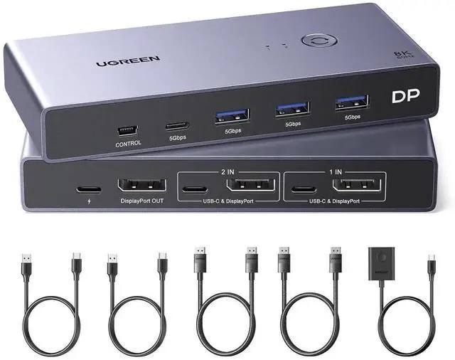 UGREEN 8K Displayport KVM Switch 2 in 1 Out DP1.4 with 4 USB 3.0 Ports(3 USB-A + 1 USB-C) Support 8K@60Hz 4K@240Hz Share 1 Monitor Keyboard Mouse U-Disk Printer, with 2 DP Cables, 2 USB A to C Cables