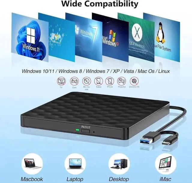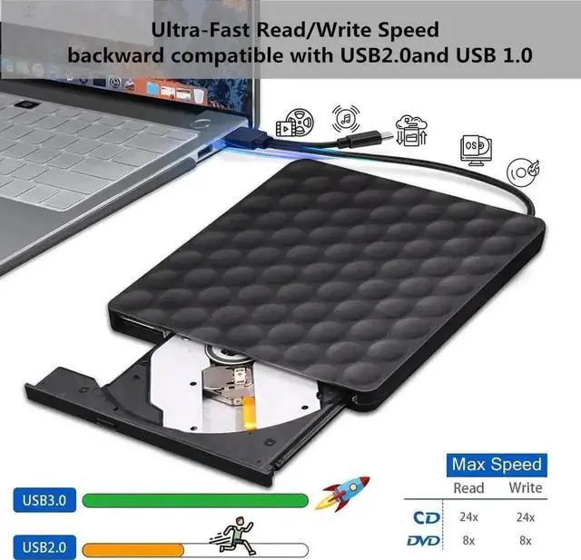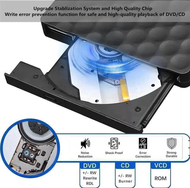 - USB optical drive produces almost no noise while processing discs and thus won't be disturbing.