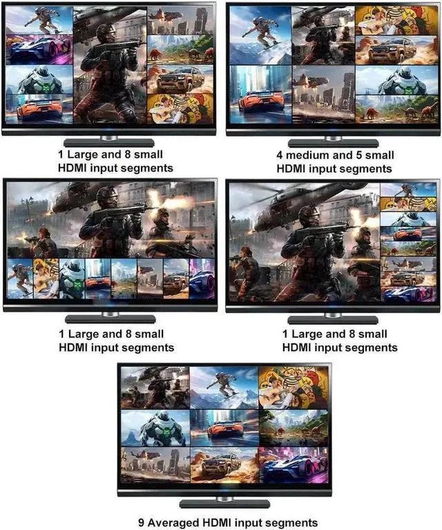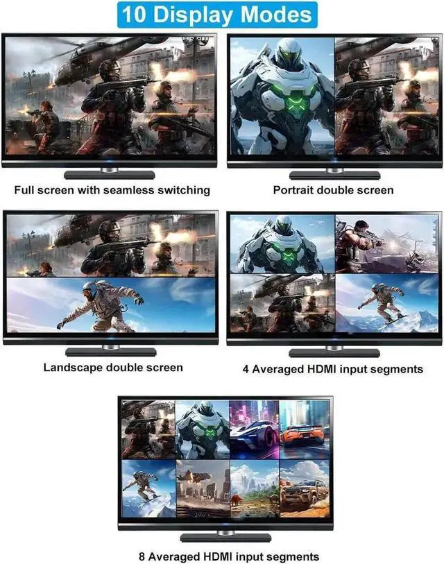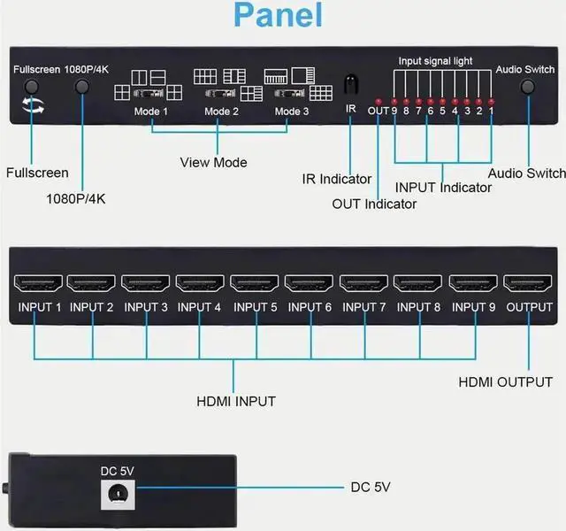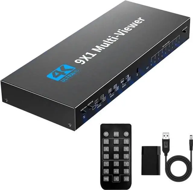 10 Adjustable Display Modes: This 9x1 screen divider multi viewer can connect up to 9 HDMI input sources, which can support multiple display modes. In the full screen mode, can seamlessly switch the full screen mode or quad modes through the IR remote control without getting up or press the Switch key at the 4K HDMI multi viewer. Also can switch the HDMI input source audio synchronization with the remote