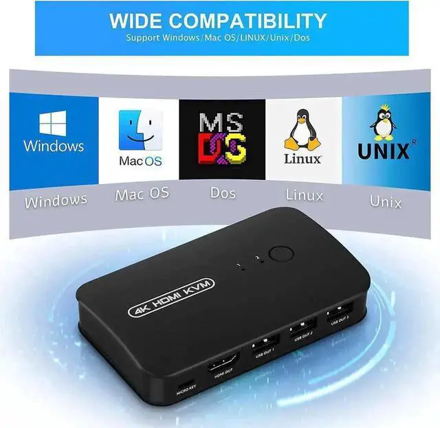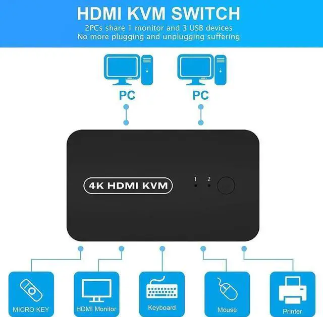 • Ideal Sharing Switches: HDMI USB KVM Switch can share one HD 4K monitor and 3 USB 2.0 devices such as scanner mouse keyboard between 2 computers.