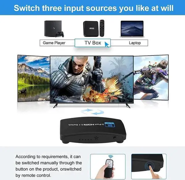HDMI 2.1 Switch : 3 HDMI ports in and 1 HDMI out for various HDMI devices, HDMI switcher 3 ports can work with most devices with standard HDMI interface. Input: PC, Laptops, Xbox 360, PS3/PS4/PS5, Roku Express, Amazon Fire TV Stick, Blu-ray DVD, etc; Output: Full HD TVs, projectors, monitors and more.