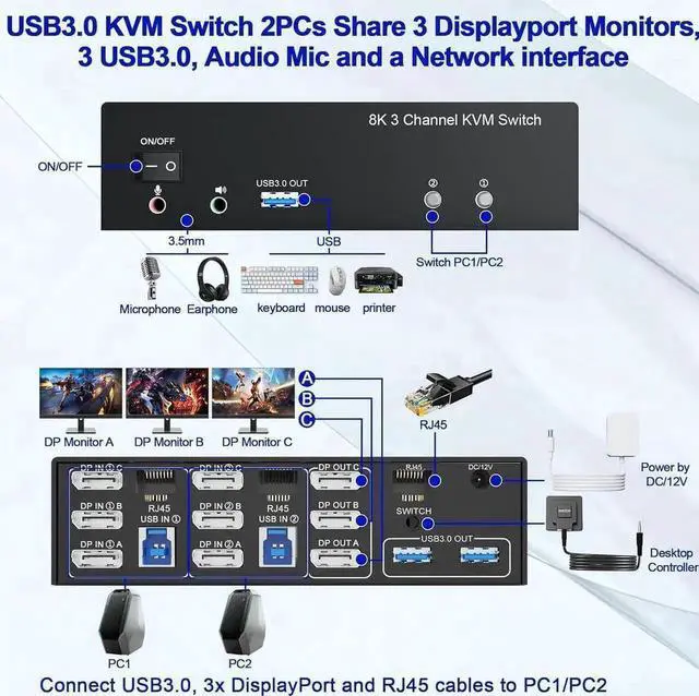 - DP1.4 Displayport KVM Switch Triple Monitor for 2 PCs Share 3 Monitors, RJ45 Ethernet Splitter 1 to 2, Audio Mic Port and 3 USB3.0 Devices