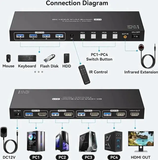 8K@60Hz HDMI KVM Switch 4 Computers 1 Monitor USB3.0 4K120Hz 4 Ports HDMI KVM Switch 4 in 1 Out for 4 Computers Share 1 Monitor and Keyboard Mouse. with 4 USB Cable and Wireless Controller
