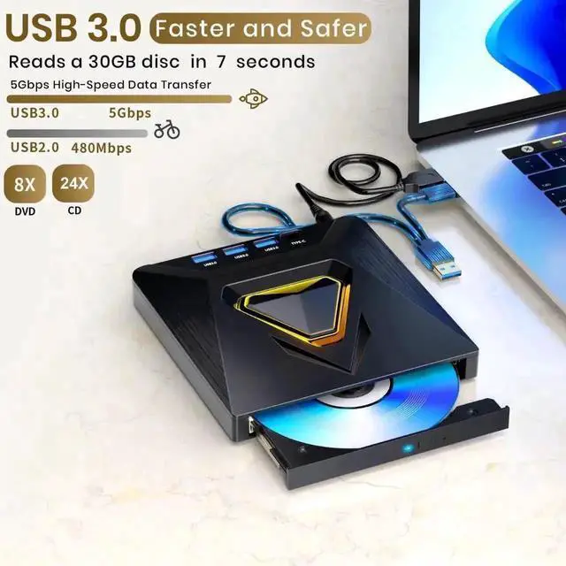 CD Burner with high speed USB 3.0 technology, many of the port cluster connectors are labelled by blue color and backward compatible with USB 2.0. USB 3.0 is an updated version of USB 2.0 which provides higher data transfer rates up to 5 Gigabits/S (625MB/S). It is approximately 10 times faster than USB 2.0. Besides that, The cd drive offers Max 8x DVDR Read Speed and Max 24x CD Write/Read speed, faster than you expected.
