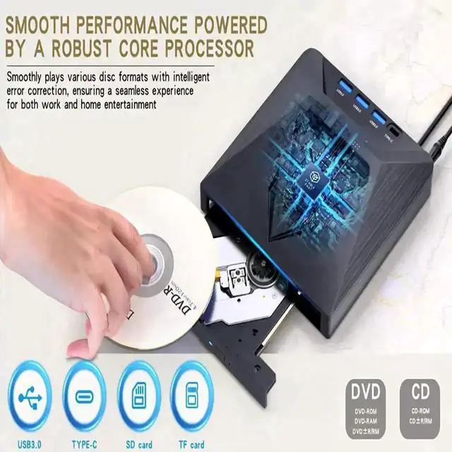 The external DVD drive is powered by a USB 3.0 port, no internal DVD driver and external power required, is the perfect companion for laptop or desktop that can be used directly by plugging it into USB port. No need for additional drivers. PLUG and PLAY. The CD Rom external drive for laptop has strong error correction, anti-skid and quiet capabilities.