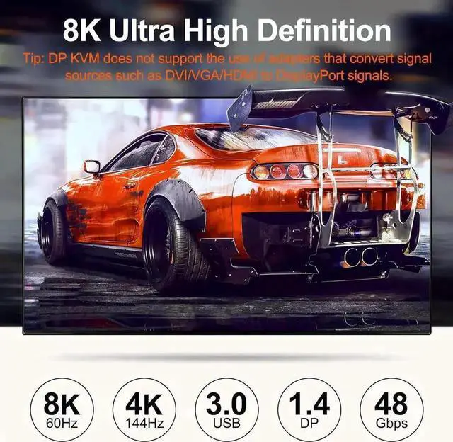 • [Ultra HD 8K@30Hz] Support resolution 4K@144Hz 8K@30Hz. this KVM aslo support input terminal to connect 4 computers with different resolutions, e.g. one is 4K@60Hz, the other is 4K@30Hz, 1440P@60Hz.