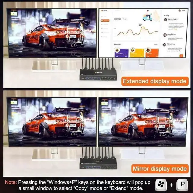 • [DP KVM Switch 4 PC 2 Monitors] This is a perfect KVM switch for DP ports device to share keyboard mouse and monitor. In copy mode the main screen can be copied to the second output screen. In extend mode, the window from the main screen can be dragged to the second output screen.