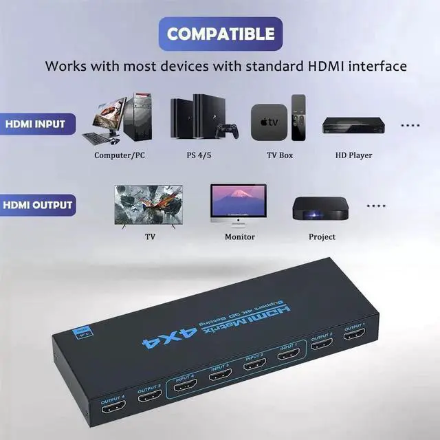 HDMI Matrix Switch 4x4: This HDMI Matrix Switch 4x4 can connect 4 HD signal sources to 4 HD display terminals not over YUV 4K@30Hz. The matrix allows 4 HDMI devices to be switched or split easily to 4 HDMI compatible monitors or projectors. It supports HDMI 1.4, 1080P@60Hz, 3D, YUV