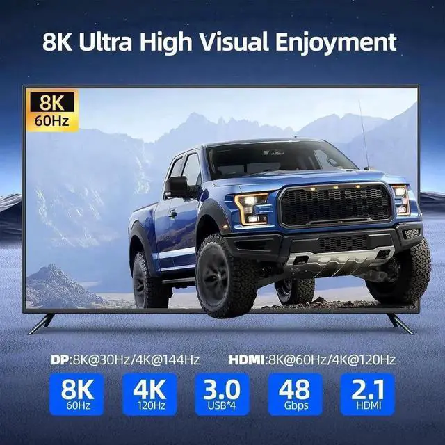• [Ultra HD 8K Visual Effect] This KVM switch supports Ultra HD resolutions up to 8K@60Hz, with backward compatibility for 4K@144Hz, 4K@120Hz, and 1080P@240Hz. (Note:To achieve the highest resolution, ensure that the signal source, HDMI cable, and DP cable all support 8K@60Hz )