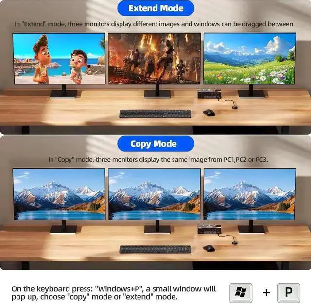 • [HDMI +2 Displayport KVM switch] This KVM Switch can control 3 computers with 1 set of keyboard and mouse, share 3 monitors and 4 USB 3.0 .(supports extended and mirrored display modes) Please note: Your computers graphics card must have 2 DP ports and 1 HDMI port to properly connect 3 HDMI monitors)