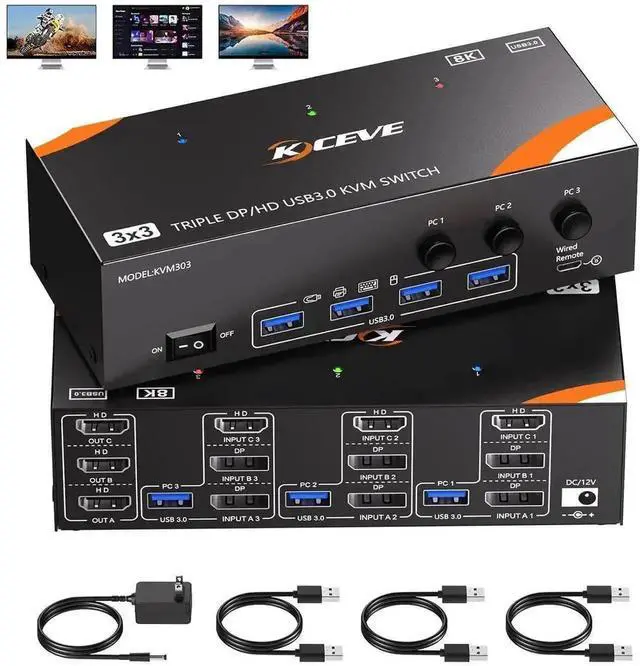KVM Switch 3 Monitors 3 Computers 8K@60Hz/4K@120Hz, HDMI + 2 Displayport KVM Switches for 3 PC Sharing Triple Monitors and Keyboard Mouse with Power Adapter, Wired Controller and USB3.0 Cables